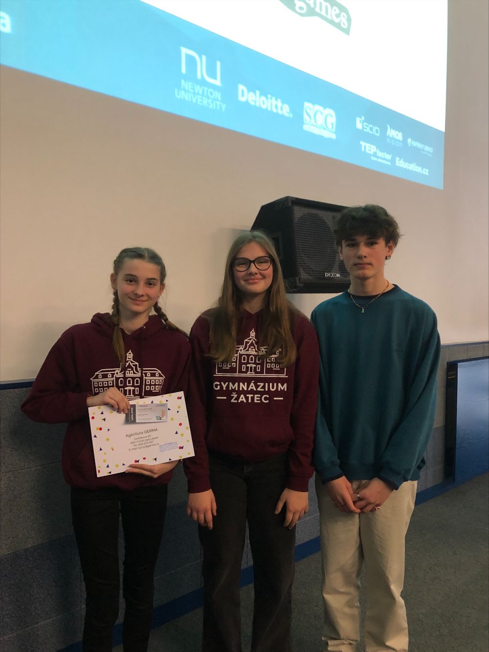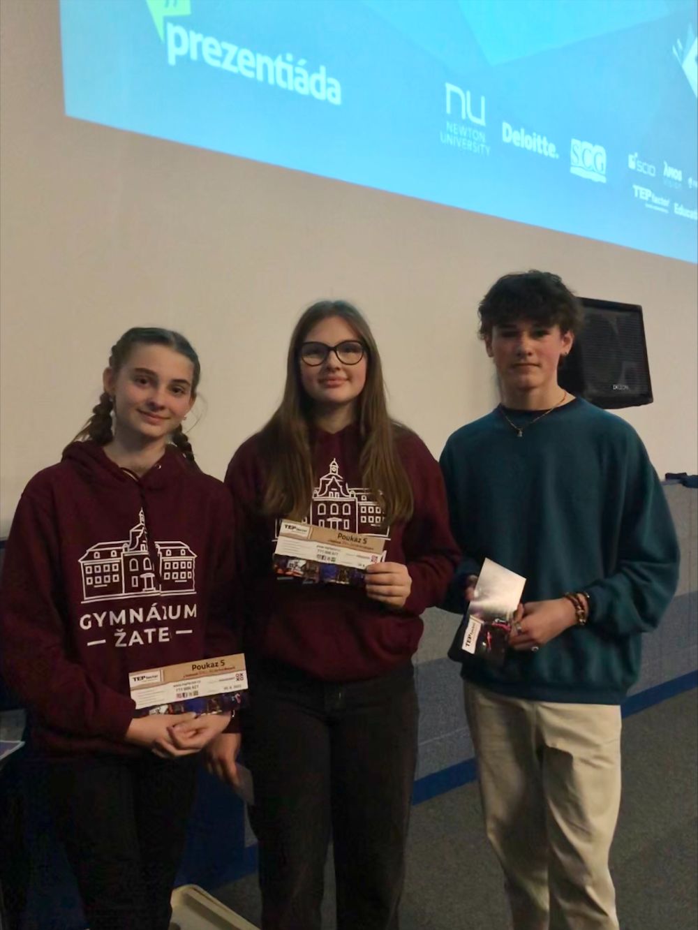 Třetí příčku obsadily slečny z Gymnázia Žatec za tým NDZT. Tento tým zaujal porotu svojí nebojácností, skvělými přednosemi a pozitivním nábojem celého projevu na odlehčené téma „Co by kdyby neexistovali umělci?“.