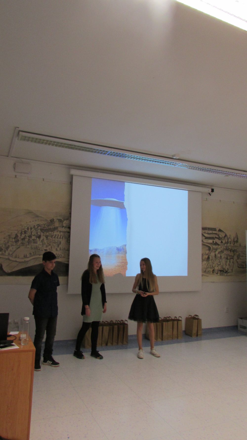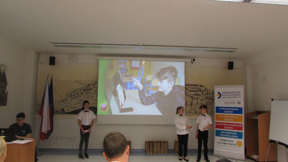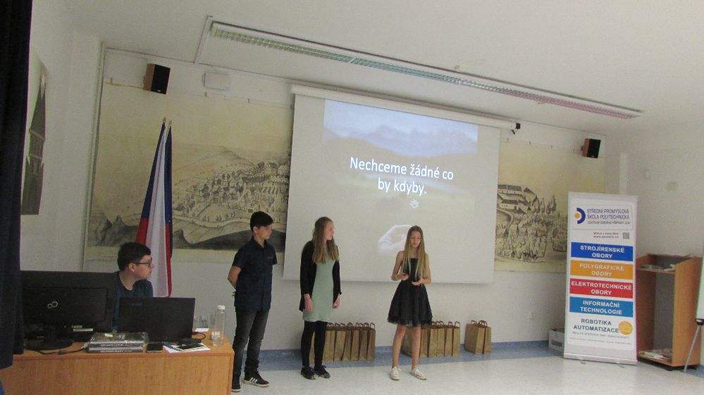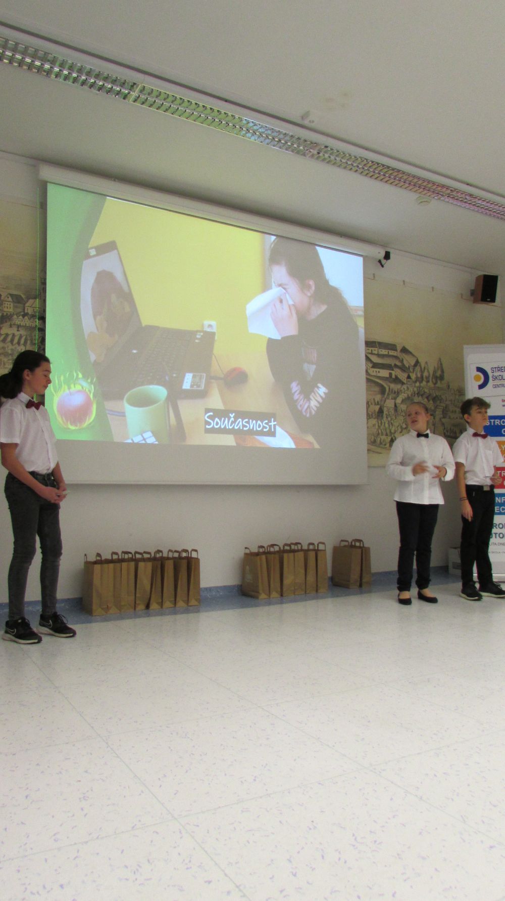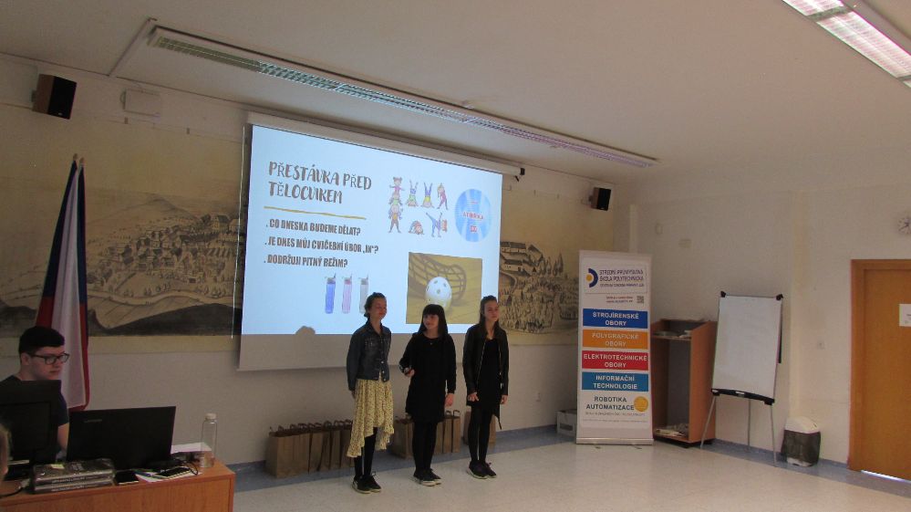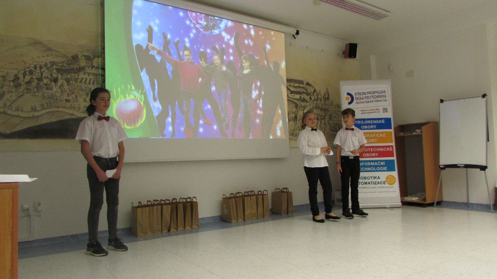 Ačkoliv byl tým MAKAJI na řadě jako první, oba jeho účastníci podali výborný výkon. Krásně rozvedené téma elektřiny nám vnuklo myšlenku, jaké by to asi bylo bez ní. Kluci Jirka a Mates prezentovali o jejich představě světa bez elektrické energie, což nám všem vyrazilo dech. Na kluky navázal tým složený ze samých děvčat s názvem Šesťácká trojka. Téma “Co řešíme o přestávkách?” pojaly po svém a představili nám jejich klasické aktivity, od chystání pomůcek, přes pletení vlasů, až po jejich oblíbenou přestávkovou hymnu.