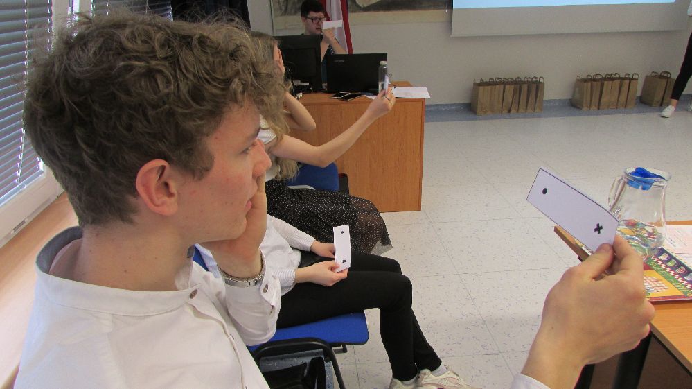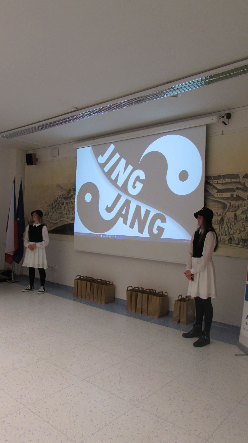 Předposledním týmem byl Jing Jang s tématem přestávky a charismatickým nástupem, díky kterému jsme ani chvilku neztratili pozornost. Hanka s Elen otevřely téma lhaní i drbů ve třídním kolektivu. Jejich prezentace spojila zajímavé aktivity s humorem a poutavým projevem o svačinách a prarodičích. Krajské kolo uzavřel tým “Elita národa” originálním pojetím tématu přestávek s prezentací o Optických klamech. Nejen, že nám svými ukázkami dívky pořádně zamotaly hlavu, ale dostali jsme i možnost zažít si optický klam na vlastní kůži.