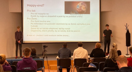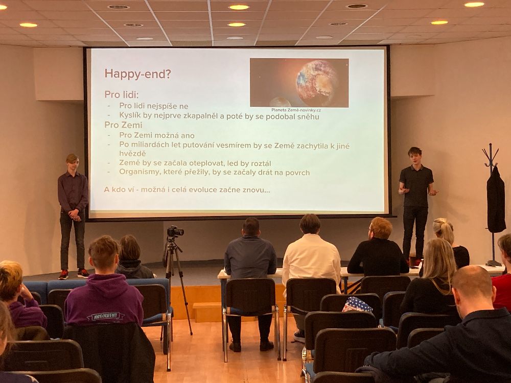 Jako další ze základní školy Bakalovo nábřeží přijeli Bakaláři Petr a Václav. Jejich prezentace na téma „Co by kdyby zmizelo Slunce“ byla uvedena pravděpodobností této situace. Kluci nám uvedli následky, které by pro nás byly katastrofální. Jediným nedostačujícím přírodním zdrojem světla by byly hvězdy, důsledkem toho by začaly umírat rostliny a přišel by úbytek organismů. Po zhruba roce by průměrná teplota na Zemi byla zhruba -73 stupňů. Lidé by museli přežívat u geotermálních zdrojů nebo pomocí termonukleární energie. Hlavní myšlenkou bylo podotknout, že bychom přežili bez Slunce a jaký by to mělo pro nás dopad.