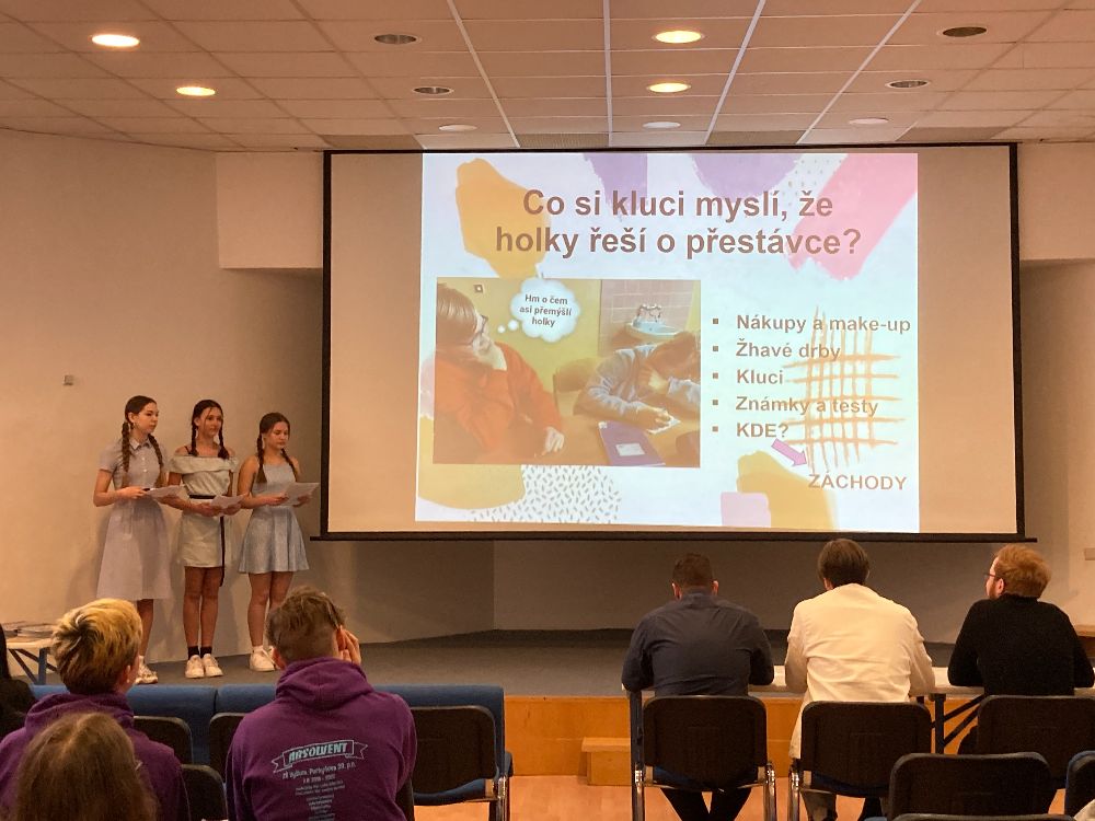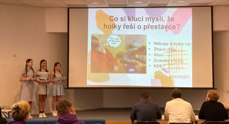 Jako další se nám představilo Trio ze základní školy Tyršova ze Slavkova u Brna. Evča, Erika a Barča si vybraly téma „Co řešíme o přestávkách“. Celá prezentace se odvíjela z průzkumu, které slečny samy zprostředkovaly. Prezentace obsahovala názory rozdělené podle pohlaví. Jejich průzkum dopadl poměrně úspěšně. Holky se nejčastěji zajímají o módu, školní záležitosti a vztahy. Kluci nejčastěji řeší hry, ale stejně jako děvčata řeší vztahy a školní záležitosti. Závěrem nám děvčata objasnila cíl jejich prezentace, kterým bylo poděkovat jejich třídě a zhodnotit třídní kolektiv.