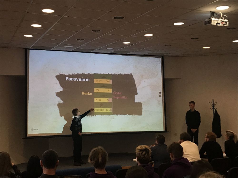 Jako první se nám představil tým s názvem Horek se svou prezentací s názvem „Co by kdyby zaútočilo Rusko na Českou republiku“, kterou si připravili Mirek a Honza ze základní školy Blížkovice. V úvodu nám představili hlavní myšlenku své prezentace, jímž bylo objasnění situace a porovnání našich šancí na úspěšný vojenský konflikt. Dále nám představili své názory, obecná fakta o situaci v naší zemi, ale také hypotézy postupu v různých situacích, které by mohly nastat. Oba představitelé byli jednoznačně zaujatí ve válečné tématice.