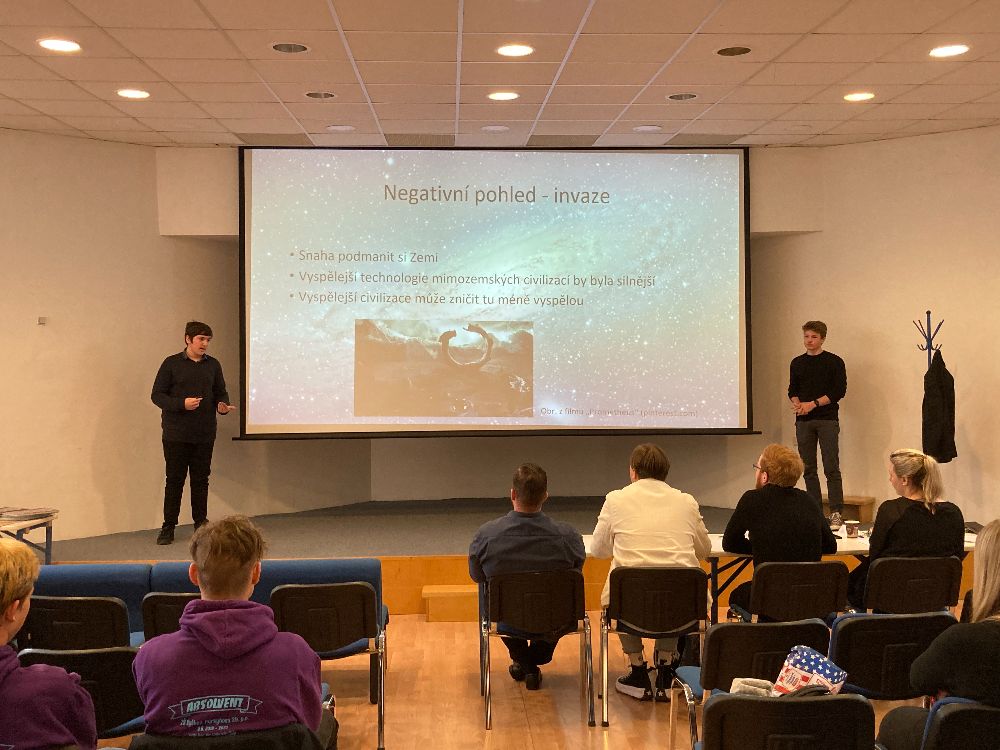 Poslední prezentaci nám představili Martin a Kryštof, tedy Astronomové z Bakalky. Měli podobné téma jako předchozí prezentace – „Co by kdyby nás navštívila mimozemská civilizace“. Pozornost věnovali pohledům lidstva na nečekanou situaci. Ve většině případů by byla spíše negativní, ale jako kladné body kluci vystihli využití nových poznatků pro vědce. Mimozemská civilizace je nám inspirací třeba v umění, jako například v literatuře nebo filmografii. Otázka, zdali jsme ve vesmíru sami, je pro nás stále nezodpověditelná a názor si tedy musíme vytvořit sami. Hlavní myšlenkou kluků však bylo, že nikdy nejsme sami, vesmír vždy někoho pošle.