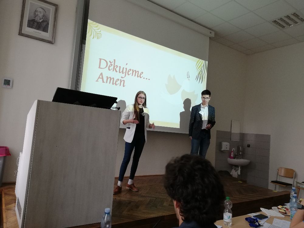 Jako první z kategorie středních škol se představil dvoučlenný Christ team. Prezentaci „11 Božích přikázání“ přednesla Karolína a Martin. Podle této dvojice je 11. přikázáním Láska. Rozloučili se s námi citátem „Milujme se navzájem, jako jsem Vás miloval já.“