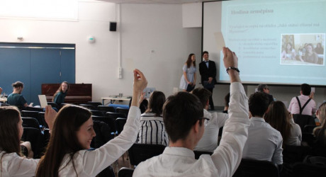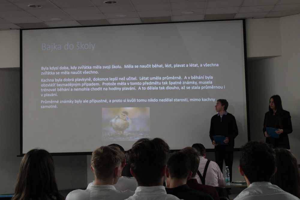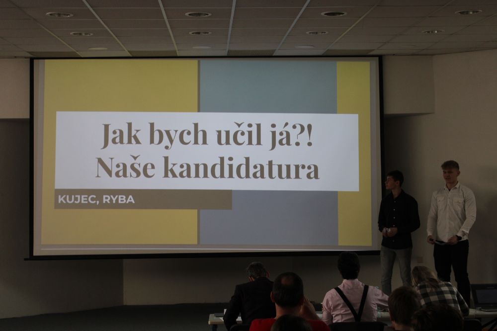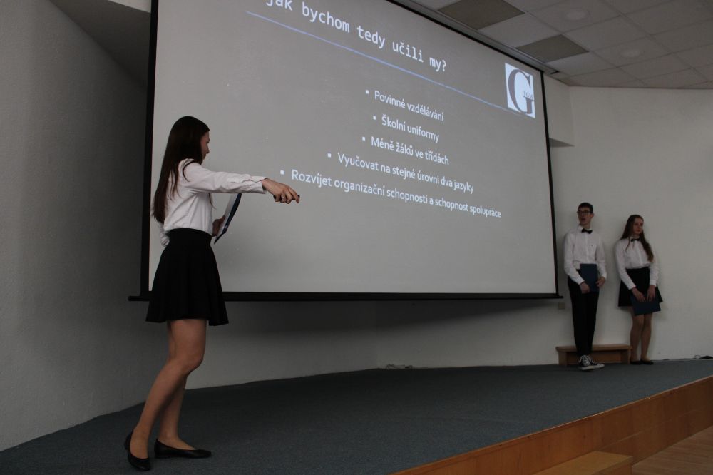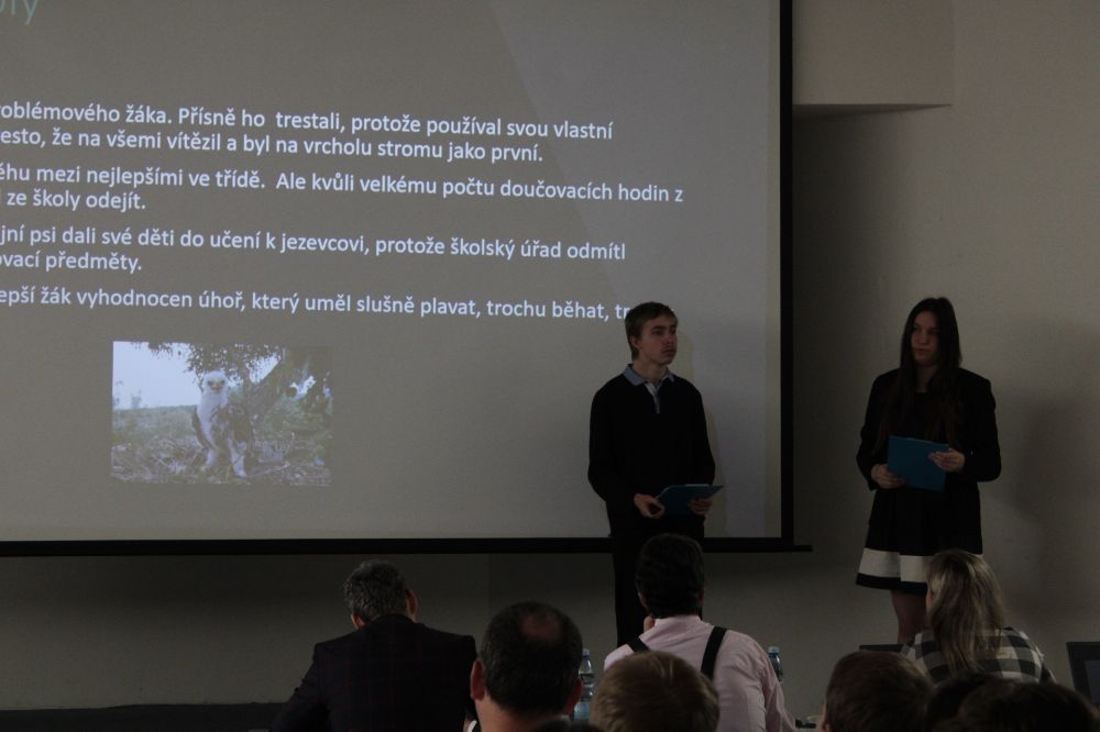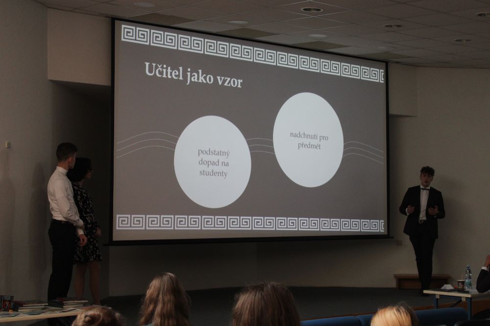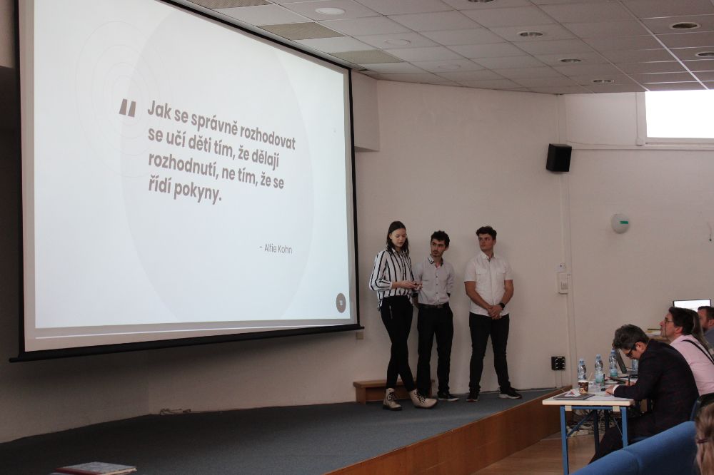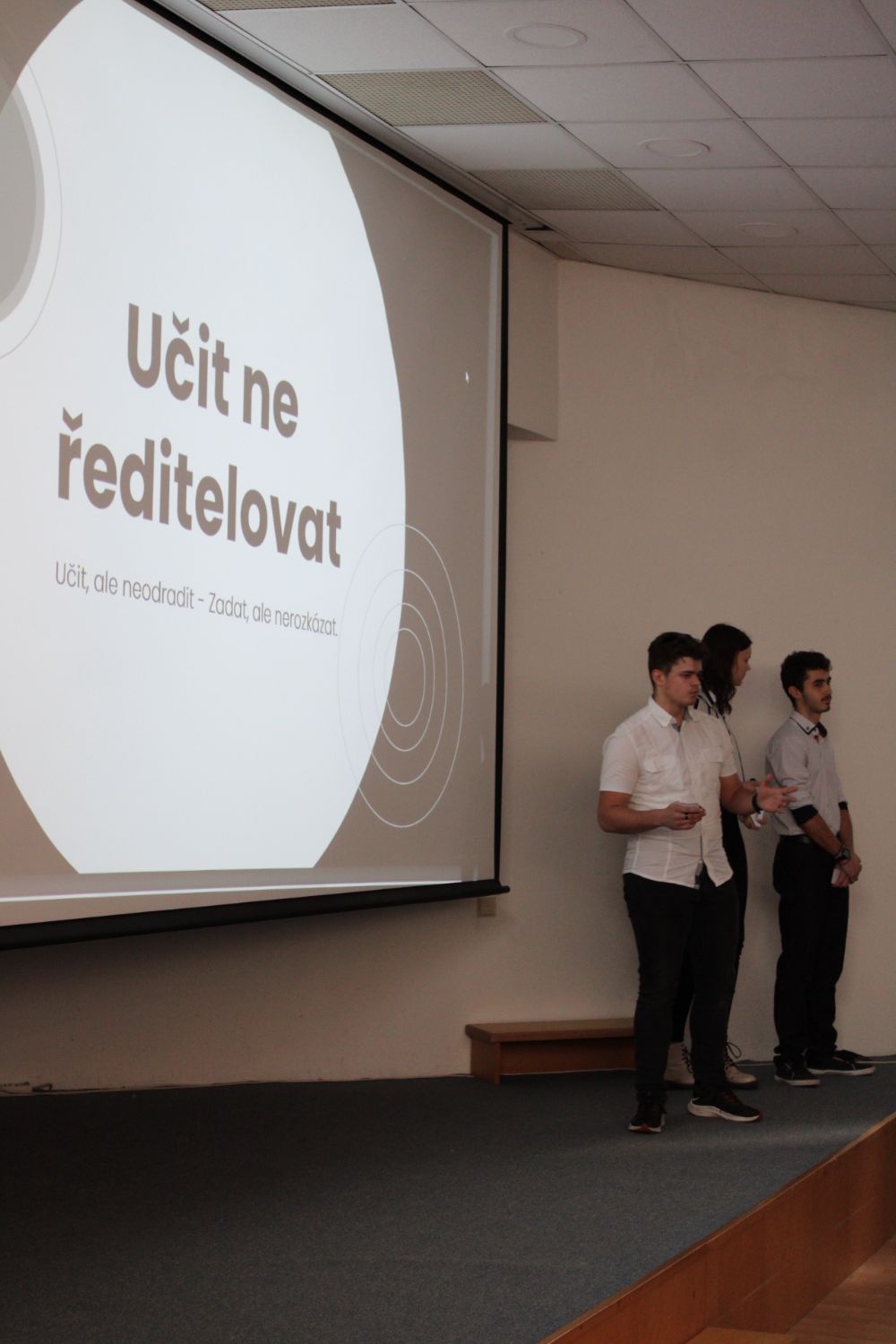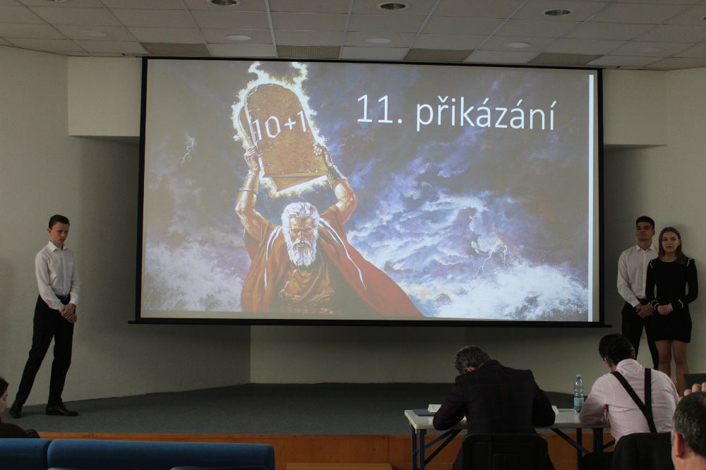 Na Krajském kole středních škol se ve čtvrtek 7. dubna sešlo patnáct týmů reprezentujících školy z celého Jihomoravského kraje. Utkali se zde studenti z Brna, Hodonína, Zastávky, Mikulova, Bučovic a ze Znojma. V příjemné atmosféře jsme sledovali prezentace na témata Jedenácté přikázání a Jak bych učil já. Konkurence byla velká a porota měla co dělat, aby výsledné pořadí sestavila.
