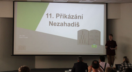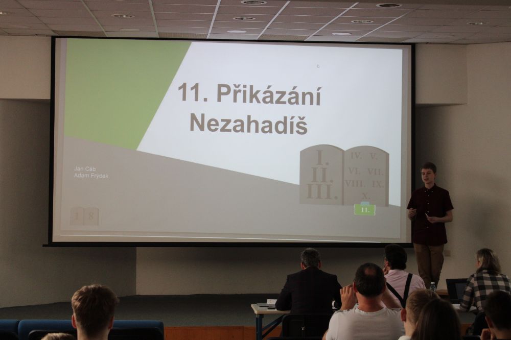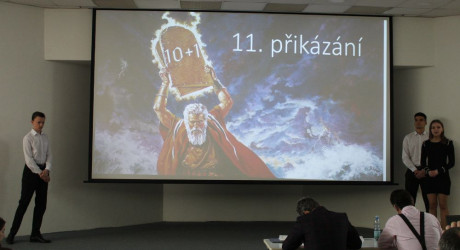 Jedenácté přikázání v podání týmu Trojramenný kríž (toto není překlep, opravdu se tak jmenují, pozn. aut.) zní: Nalož se svým časem rozumně! Ve své prezentaci se zabývali otázkou toho, co to je volný čas, jaké jsou jeho funkce, a jak jeho využívání, nebo naopak opomíjení, ovlivňuje náš život. Věděli jste, že otázka, jak trávit volný čas, se objevila až na přelomu 19. a 20. století? Souviselo to se zkracující se pracovní dobou. V prezentaci jsme se taky dověděli spoustu zajímavých dat. Každé páté české dítě nenavštěvuje žádný kroužek. Zatímco v jedenácti čte pravidelně každé druhé dítě, v patnácti už je to jen každý pátý. Děvčata se věnují více individuálním sportům, kluci zase spíš těm kolektivním. Trojramenný kríž se rozhodl uspořádat vlastní dotazník, ve kterém pokládal svým spolužákům otázku „Jak trávíš svůj volný čas?“ Mezi těmi tradičními se objevilo i několik ne zase tolik tradičních odpovědí. Publikum nejvíce pobavila odpověď „S kamarády venku, to asi neznáš lol“.
