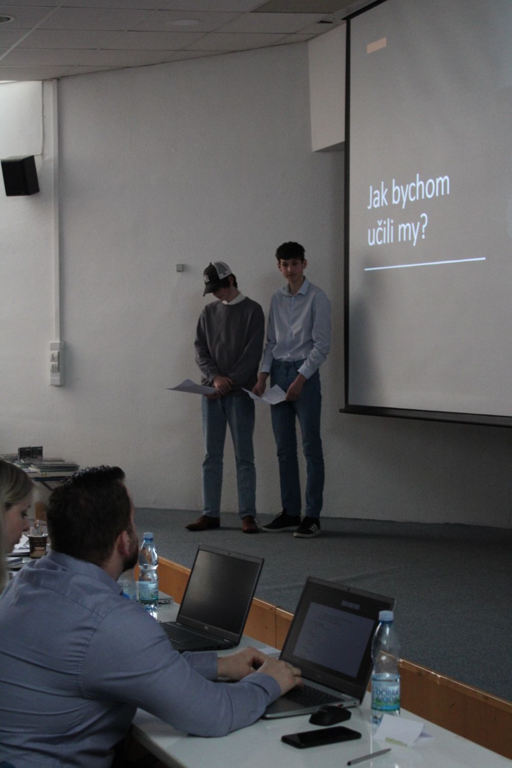 Jako první se nám se svojí prezentací na téma Jak bych učil já představil tým Ne-šprti z Vyškova. Prezentace pojednávala o názorech studentů na školský systém. Žáci se v současném systému mají učit velkou škálu předmětů, ale vyučující učí většinou jenom dva předměty – a ty berou jako jasnou prioritu. Učitelé by si tedy podle Ne-šprtů měli uvědomit, že jejich předměty jednoduše nejsou to jediné. Je nezbytné ptát se na tu nepříjemnou otázku „A k čemu mi to bude?“, protože přeci nemá smysl učit se něco, co k ničemu není. Žáci by taky měli mít možnost se rozdělit do skupin podle své zdatnosti. To, do které skupiny budou patřit, by si měli sami stanovit. V neposlední řadě je taky potřeba podávat žákům kvalitní zpětnou vazbu, ne jen známky, které nebývají příliš povzbudivé. Škola má podle Ne-šprtů smysl jen tehdy, když se sama rozvíjí a posouvá.