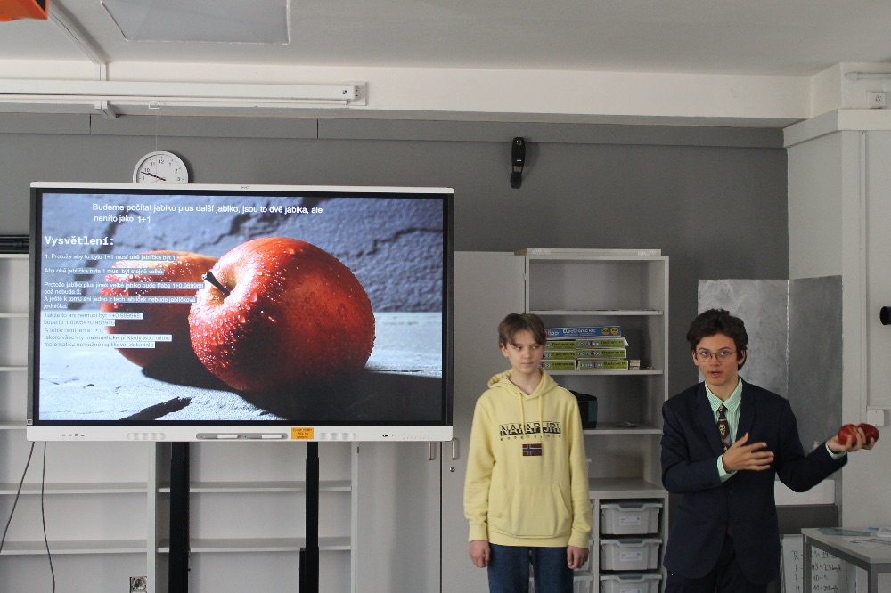 S blížícím se časem oběda nás svými rekvizitami navnadila dvojice chlapců Kirillo a Michael alias MIKI. Na příkladu dvou jablek, které Michael po dobu prezentace schovával v kapsách saka, nám vysvětlili, že 1+1 se ne vždy musí nutně rovnat dvě. Přednesli příklady z matematiky základní školy, rodinného prostředí a binární soustavy.
