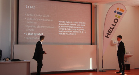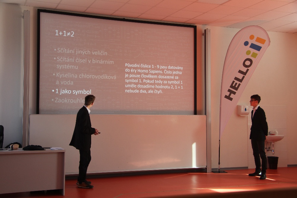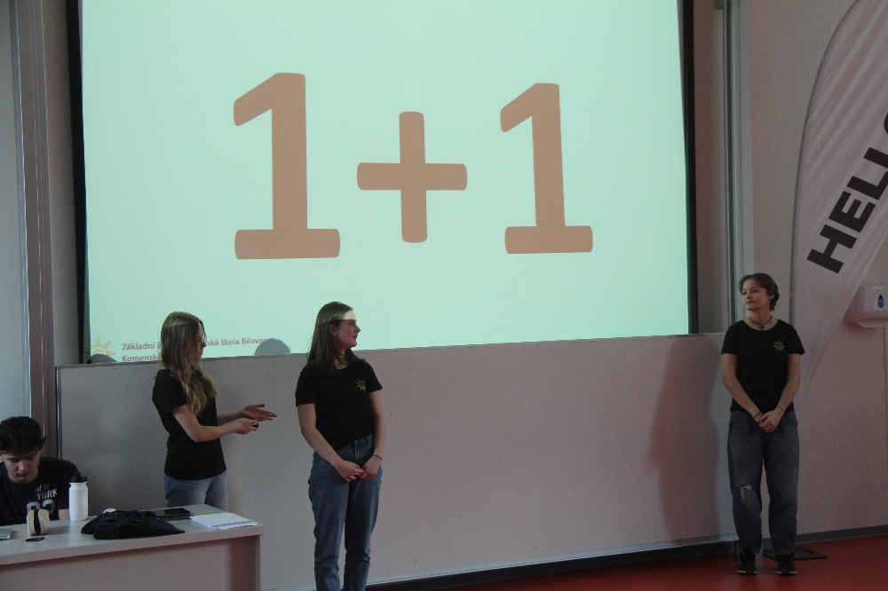 V ladících outfitech se dostavil tým Tři Grácie, který nám ukázal pravé „outside of the box” myšlení. Na téma 1 + 1 totiž Grácie vymyslely spoustu možných odpovědí. Opravdu se příklad vždy rovná dvoum? Například, i když je třída během cizích jazyků rozdělená, stále tvoří jeden celek. Na opačné straně, 1 + 1 může vést i k vysokým číslům. Přeci jen, dvě bankovky či mince málokdy dají hodnotu dvě.
