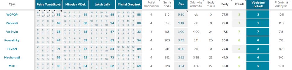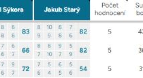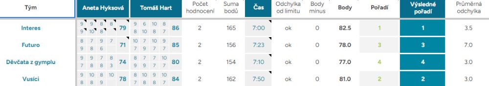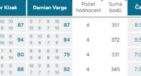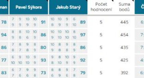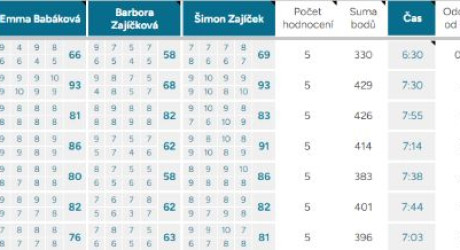 Pořadí – Automaticky vyplněné pořadí podle bodového průměru. První tři místa jsou zvýrazněna