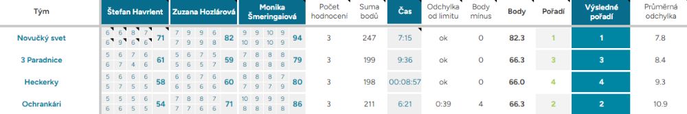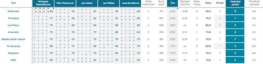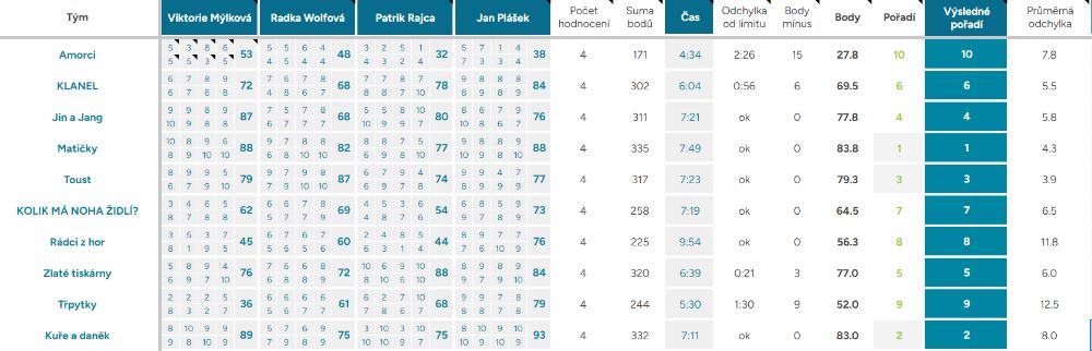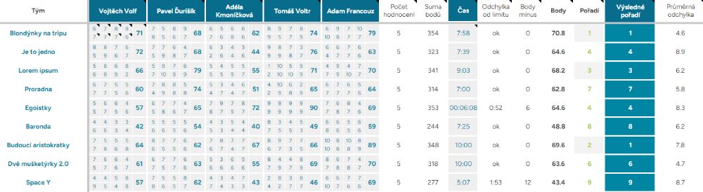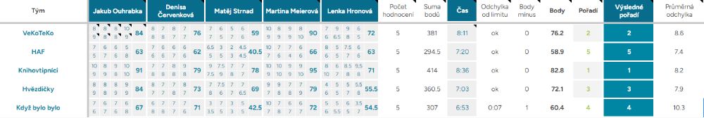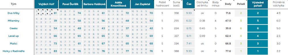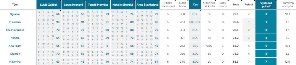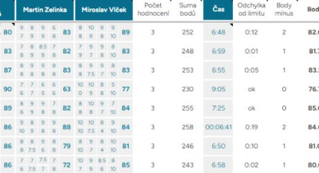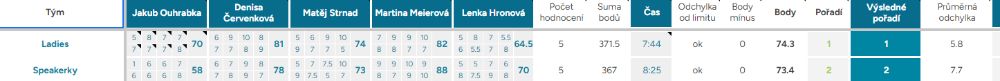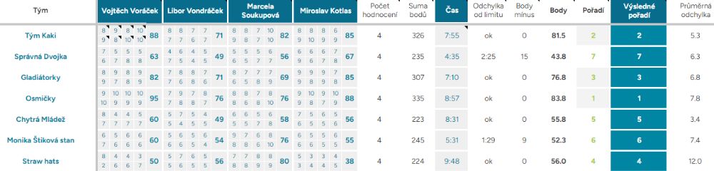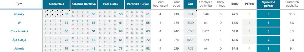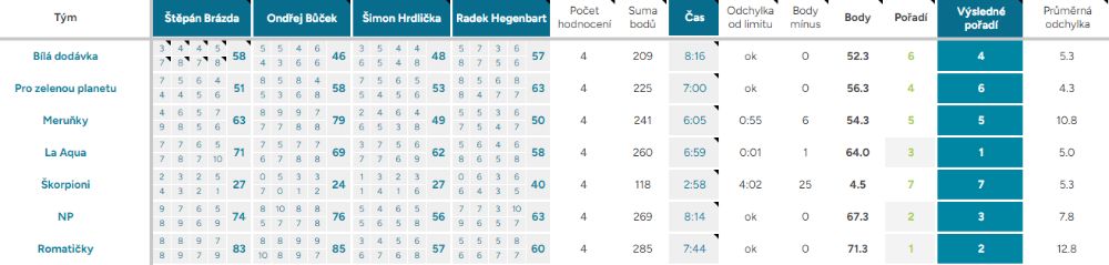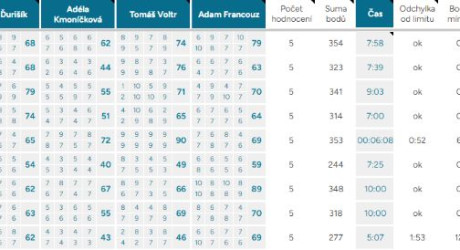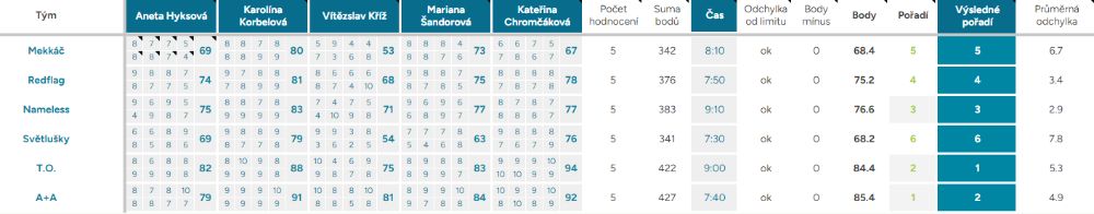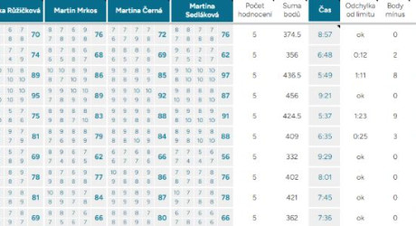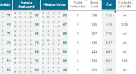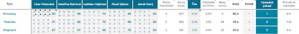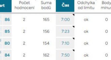 Odchylka od limitu – ukazuje, o kolik vteřin, respektive minut, se tým nevešel do čas. limitu kterýmkoliv směrem, ok – tým nepřekročil limit