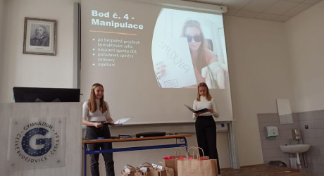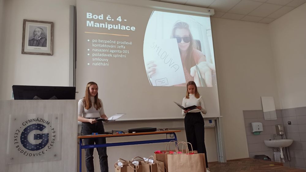 Dne 10.4. 2024 se na Gymnáziu Česká v Českých Budějovicích konalo krajské kolo pro střední školy. Během dne jsme byli nejen zmanipulováni, ale dozvěděli jsme se i spoustu nových věcí, jako třeba tajný recept Loca-Loly.
