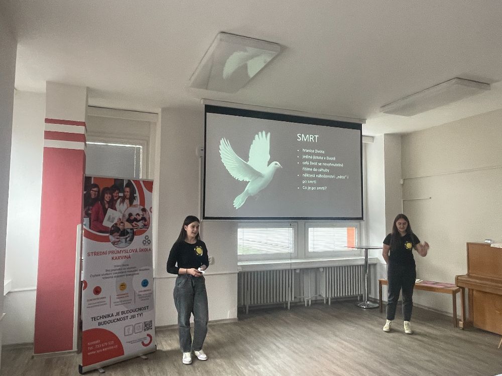 Na řadu přišly Sluníčka. Jejich prezentace ale tak sluníčková nebyla. Kristýna, Valentina a Bára se společně ponořily do filozofie ničeho a času. Citovaly Alberta Einsteina a jeho teorii relativity. Zaměřily se na paradox samotného pojmu “nic” – pokud o něm mluvíme, už existuje. Propojily téma s astronomií, počátkem vesmíru a otázkou, co je po smrti.